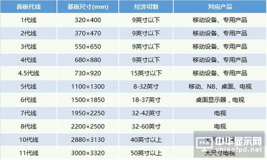 顯示面板代線和玻璃基板尺寸及終端產品對應情況