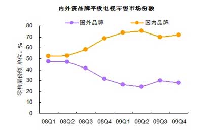 圖1 2008-2009年中外品牌平板電視零售市場份額(數據來源:奧維咨詢)