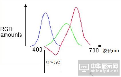 下圖清晰地反映了這一點,橫坐標表示光的波長,縱坐標表示各種顏色所需要三基色刺激值。