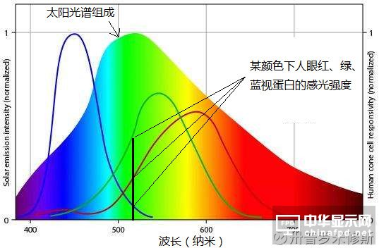 人類眼睛使用RGB感光系統,通過紅、綠、藍三種顏色傳感器(視錐細胞)來感受各種波長的光線,不同顏色的光線引起這三個傳感器的激發度不同,大腦組合這些信息形成意念中的顏色。顯示面板就利用了這一點,使用三個紅、綠、藍發光點組合成一個像素點,通過混色產生各種顏色??陀^地說,由紅色+綠發光點混色產生的“黃色”光線(實際上是波長為500nm和700nm的兩種光線混在一起)和單純的波長為570nm的黃色光線是不同的,但是在人眼看來,他們是一樣的。