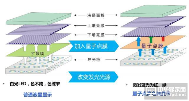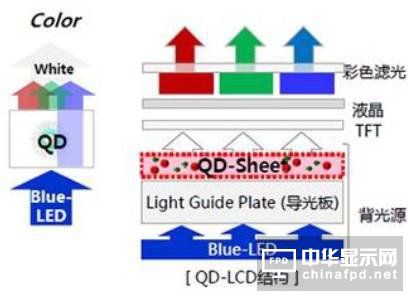 因為QLED量子點自發光技術難以實現,所以與LCD 結合的改良版QD-LCD技術就應運而生,QD-LCD是在LCD上加一層量子點膜(或非膜的其他方式),這些量子點材料與藍色發光二極管協同工作,藍色發光二極管產生藍色光,并且為量子點提供兩種不同方法供應光子能量,以產生紅色和綠色的光。