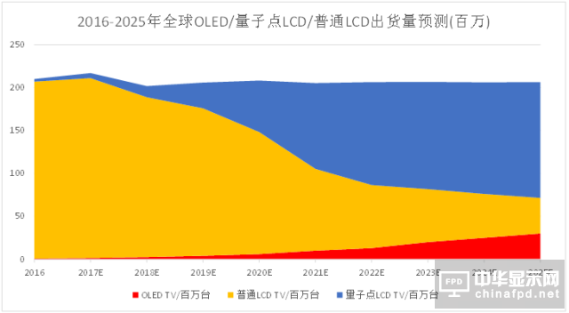 根據統計數據,全球電視銷量維持在每年2億部左右,2016年新型顯示方案中OLED電視出貨量為80萬(主要LG貢獻),量子點電視300萬臺(主要是三星貢獻),因此目前98%以上的電視仍未普通LCD電視。