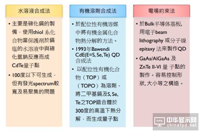 目前量子點合成法主要有三種:水溶液合成法、有機溶劑合成法和電場約束法。