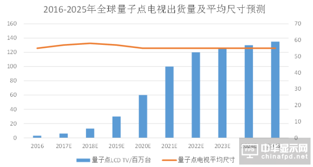 由于量子點電視未來滲透趨勢是從高端(高端電視一般尺寸較大)開始滲透,并且整個電視行業的屏幕尺寸一直沒停止大屏化趨勢,我們判斷量子點電視平均尺寸為55寸左右,而55寸電視的顯示面積約等于1平方米,那么在數量上,量子點膜的出貨面積約等于量子點電視的出貨量。