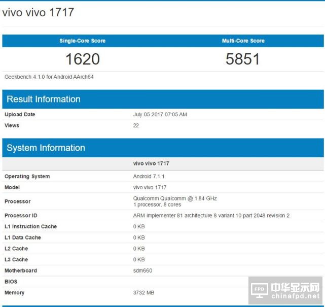 此次出現(xiàn)在知名跑分網(wǎng)站Geekbench的vivo 1717在配置上并沒有特別的地方,預(yù)裝的是Android7.1.1系統(tǒng),并擁有4GB內(nèi)存,搭載的是1.84GHz主頻的驍龍660處理器,但單核和多核的跑分成績分別達到了1620和5851,不僅超越了擁有同款處理器的vivo TD1608的表現(xiàn),而且在所有vivo手機的跑分排名中更是高居榜首。