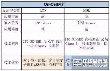 4、On-Cell應(yīng)用于OLED具有天然優(yōu)勢(shì),OLED不需要彩色濾光片,因此觸控模組只需嵌入在封裝玻璃之上偏光片之下即可,相比應(yīng)用與TFT-LCD上技術(shù)難度反而降低。