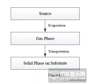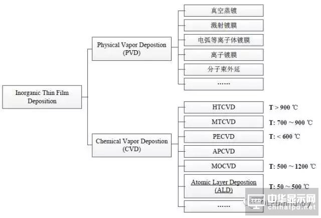 在FDP 的生產(chǎn)中, 在制作無機薄膜時可以采用的方法有兩種:PVD 和CVD (本文跟從眾多資料的分類法, 將VE 和VS 歸于PVD 而ALD 歸于CVD)。