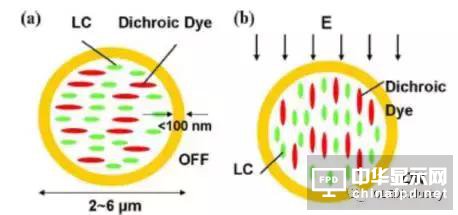 在外加電場驅動下,液晶分子和二色性染料分子的排列取向與電場方向一致,從而表現出明(彩色)/暗對比的顯示效果