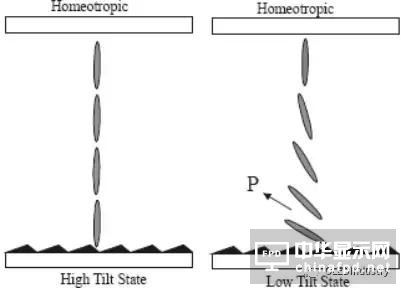 受表面錨泊作用的影響,液晶分子在槽柵橫截面上的取向存在著高、低傾角兩個穩定狀態,該穩態效果是槽柵深度和槽距比例的函數,兩種穩態效果之間的轉變可以通過外加電場的調節來實現。
