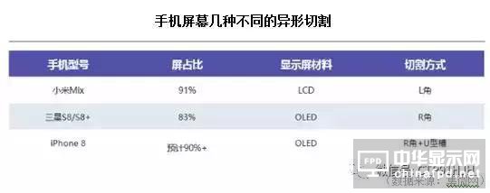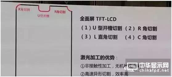 目前異形切割的主流方案是在屏幕面板上切兩個C角,兩個R角,一個U槽。