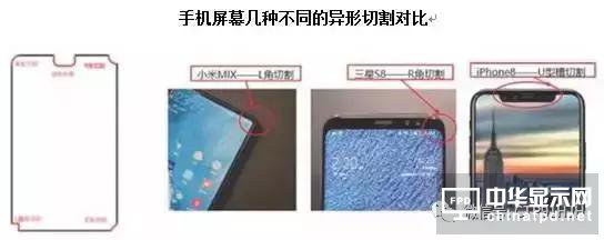 “異形切割”是根據不同需要對屏幕進行R角切割、U型開槽切割、C角切割等。其目的主要有兩方面:一方面要在屏幕四角做C角或者R角切割,同時通過加緩沖泡棉等進行邊緣補強,以防止碎屏。另外一方面是需要在屏幕上方做U形切割,為前置攝像頭,距離傳感器,受話器等元件預留空間。