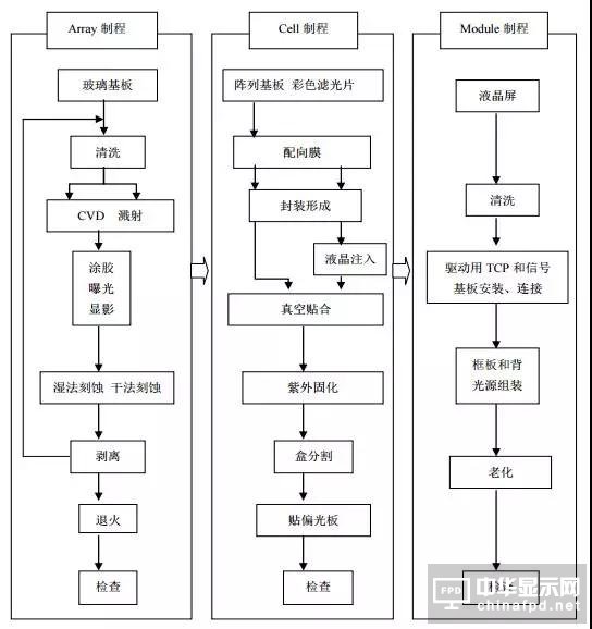 TFT-LCD為代表的顯示面板生產過程主要分為三個工序: