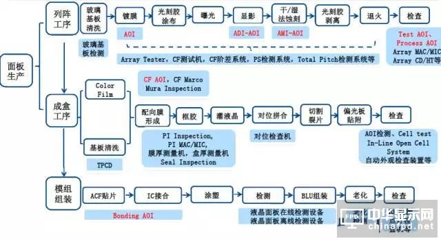 根據所處制程分類Array制程檢測系統:Array測試機、CF測試機、PS檢測系統、CF階差系統、Total Pitch檢測系統、AOI光學檢測系統等;