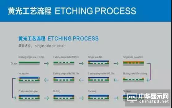 將涂有光刻膠的鍍膜玻璃進行曝光、顯影處理,然后通過溶液實現(xiàn)腐蝕處理掉所需除去的部分(ITO或金屬)、用離子反應或其它機械方式來剝離、去除光刻膠材料的一種過程。