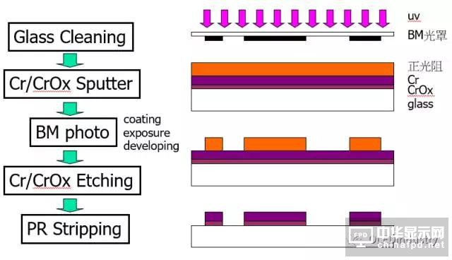 負光阻制程 :光阻沒照到紫外光的部份會在后續顯影步驟中被移除。如 : R, G, B, PS.