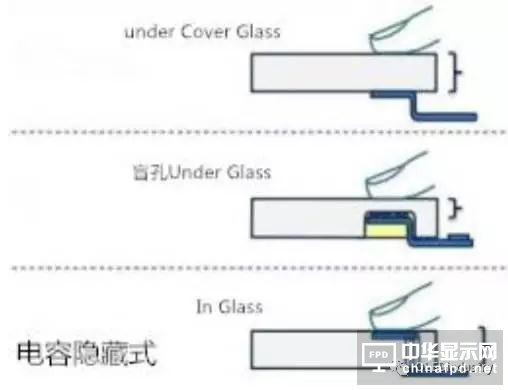 隱藏式又分三種,Under Glass 需要在玻璃蓋板上挖盲孔,目前工藝要求高,良率比較低;In Glass 將Sensor 融合進玻璃之中,工藝難度大,目前不具備量產條件;Under Cover Glass 方案達到電容識別極限,目前效果比較差。