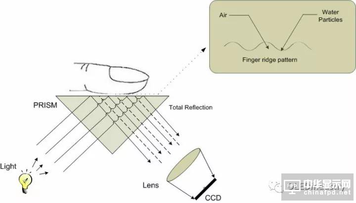 光學指紋識別是目前使用最廣泛的指紋識別技術,它的原理是將手指放在光學鏡片上,手指在內臵光源照射下,用棱鏡將其投射在電荷耦合器件上,進而形成脊線呈黑色、谷呈白色的數字化的、可被指紋設備算法處理的多灰度指紋圖像。