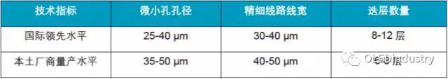 目前,國際領先的規模量產水平已經達到了微小孔孔徑25-40 μm,30-40 μm 線寬和8-12 層的迭層量級。日本旗勝正在申請專利的超微細FPC 產品孔徑已經達到10 μm,最小間距達到25 μm。