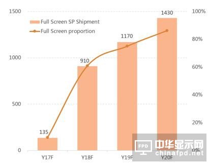 根據群智咨詢(Sigmaintell)的預測,2017年全球全面屏智能手機的出貨將超過1.3億部,而2018年將是全面屏手機全面爆發的一年,出貨量將達到9.1億部,全面屏產品在智能手機中的滲透率將達到61%。預計至2020年,全球全面屏智能手機出貨量將達到14.3億部,滲透率超過85%。