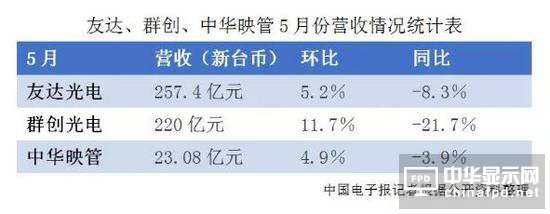 據(jù)了解,友達光電5月份未經(jīng)審核的綜合營收達到257.4億元新臺幣,環(huán)比增長5.2%,同比下降8.3%。群創(chuàng)5月份營收為220億元新臺幣,環(huán)比增長11.7%,但同比下降21.7%。中華映管5月份合并營收為23.08億元新臺幣,環(huán)比上漲4.9%,但同比下降3.9%。