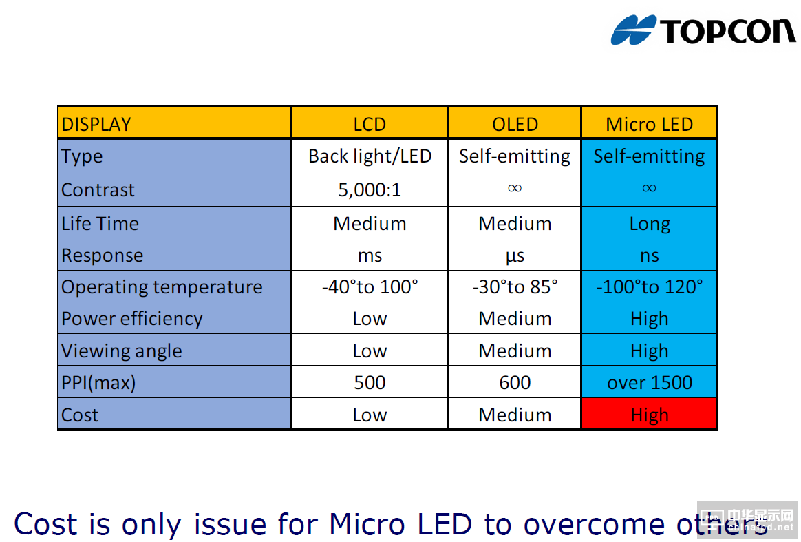 將LCD、OLED、Micro LED三種技術(shù)進(jìn)行對比,西川和人認(rèn)為,三者之間最大的差異在于成本——這也是Micro LED和OLED進(jìn)入市場的最大障礙。作為一家從事光學(xué)檢驗(yàn)的公司,Topcon與很多客戶合作,極大地提升了Micro LED在制作過程中的良品率。他介紹說,在量產(chǎn)之前對產(chǎn)品進(jìn)行檢驗(yàn),識(shí)別出存在缺陷的零部件,利用算法和軟件向客戶進(jìn)行反饋后,客戶可對產(chǎn)品進(jìn)行優(yōu)化,這有助于客戶減少制造成本。