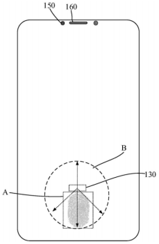 如上圖所示為該專利提供的手機(jī)結(jié)構(gòu)示意圖,其中主要包括顯示面板110(如下圖所示)、光學(xué)指紋模組120(如下圖所示)、結(jié)構(gòu)光發(fā)射組件130,結(jié)構(gòu)光發(fā)射組件的發(fā)射光在顯示面板上的照射區(qū)域覆蓋光學(xué)指紋模組的指紋識(shí)別區(qū)域。