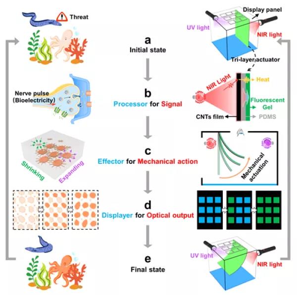 圖1.頭足類動物變色機理(左)和“光-機械運動”調制熒光系統設計示意圖(右)