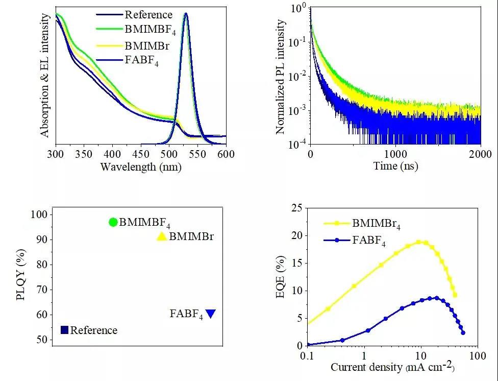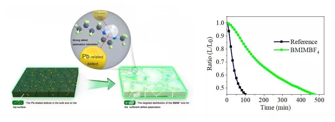 通過比較分析含有不同陰陽對離子的離子液體(BMIMBF4,BMIMBr和FABF4)修復(fù)鈣鈦礦薄膜的光物理特性和器件性能,發(fā)現(xiàn)缺陷鈍化主要來源于BMIM+ 離子,而BF4-離子的鈍化效果不明顯。BMIMBF4修復(fù)的鈣鈦礦多晶薄膜的光致發(fā)光量子產(chǎn)率接近100%,表明薄膜中的缺陷點位得到了充分鈍化。