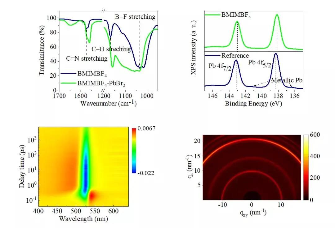 FTIR和XPS測試結(jié)果表明,BMIM+離子的鈍化主要為咪唑環(huán)上C=N官能團對鉛相關(guān)的離子或原子缺陷的路易斯酸堿相互作用;同時,氫鍵相互作用加強了缺陷鈍化效果。TAS測試結(jié)果進一步證實鈣鈦礦薄膜中的非輻射復(fù)合得到了有效抑制;并通過GIWAXS測試分析推測,BMIM+ 和BF4-離子沒有進入鈣鈦礦晶格而靶向地分布于薄膜的晶界和表面, 有利于缺陷點位的充分鈍化。