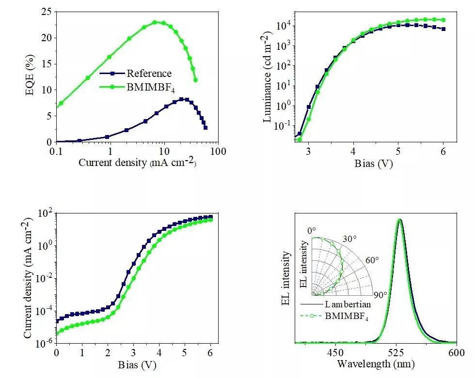 近日,電子科技大學(xué)光電科學(xué)與工程學(xué)院李世彬教授課題組在ACS Energy Letters (美國化學(xué)學(xué)會-能源快報)上發(fā)表了題為“Targeted Distribution of Passivator for Polycrystalline Perovskite Light-Emitting Diodes with High Efficiency”的高效率鈣鈦礦LED最新研究成果。光電科學(xué)與工程學(xué)院2018級博士研究生彭雪峰和西南大學(xué)物理科學(xué)與技術(shù)學(xué)院楊曉暉為共同第一作者,光電科學(xué)與工程學(xué)院李世彬和陳力教授為共同通訊作者,電子科技大學(xué)光電科學(xué)與工程學(xué)院為第一作者單位。該工作采用離子液體(BMIMBF4)修復(fù)多晶鈣鈦礦薄膜,通過路易斯酸堿的鈍化作用和BMIM+ 離子鈍化劑的靶向分布,實現(xiàn)了充分缺陷鈍化進而大幅提高器件的發(fā)光效率和工作穩(wěn)定性。基于本研究組已報道的能夠高效鈍化多晶鈣鈦礦薄膜下表面的聚苯乙烯磺酸鈉改性PEDOT:PSS空穴傳輸層,制備了離子液體(BMIMBF4)靶向分布引起對PEA(FAPbBr3)4Br鈣鈦礦薄膜充分缺陷鈍化的高效率發(fā)光二極管,其外量子效率為22.9%,電流效率為98cd A-1 ,發(fā)光波長為529nm。