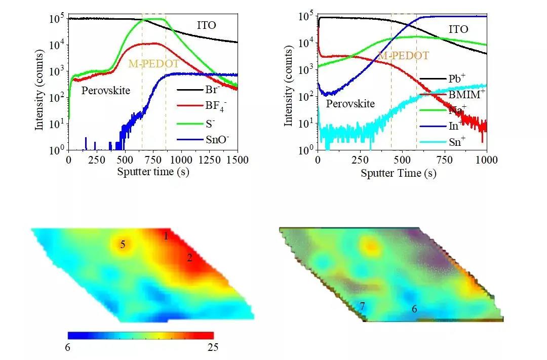 進一步采用SIMS測試分析發(fā)現(xiàn),BF4-離子主要分布于空穴傳輸層及其與鈣鈦礦層的界面,進一步證實了缺陷鈍化不是來源于BF4-離子;然而,BMIM+離子靶向地分布于鈣鈦礦薄膜內(nèi)部和上表面并與缺陷點位的分布有很好的匹配,進而促進了鈣鈦礦薄膜中缺陷點位的完全鈍化。鈣鈦礦發(fā)光層的Nano-IR Mapping同時直觀地顯示出了BMIM+離子的上表面聚集和缺陷鈍化相互作用,分析發(fā)現(xiàn)BMIM+ 離子的聚集并沒有完全覆蓋薄膜表面且其隨機的分布與薄膜形貌無關(guān);然而,BMIM+離子缺陷鈍化相互作用的信號基本完全覆蓋整個薄膜,直觀地表明并證實了BMIM+離子鈍化劑的靶向分布能夠充分鈍化形成于多晶鈣鈦礦薄膜晶界和表面的缺陷點位。