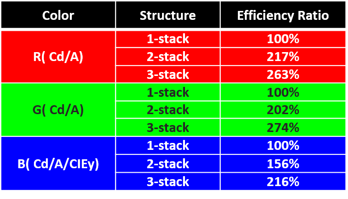 Tandem OLED技術即疊層蒸鍍顯示技術,是通過電荷產生層將多個發光單元串聯起來的一種器件結構。除兼具單層蒸鍍技術的全部特性之外,疊層蒸鍍顯示技術還具有低功耗(功耗降低超過30%)、高亮度(提升兩倍以上)、長壽命(器件壽命延長四倍以上)的優異特性。以上優點對于產品壽命有較嚴苛要求的應用場景,如平板、筆電、車載等中大尺寸領域應用具有重要的意義和廣闊的前景。