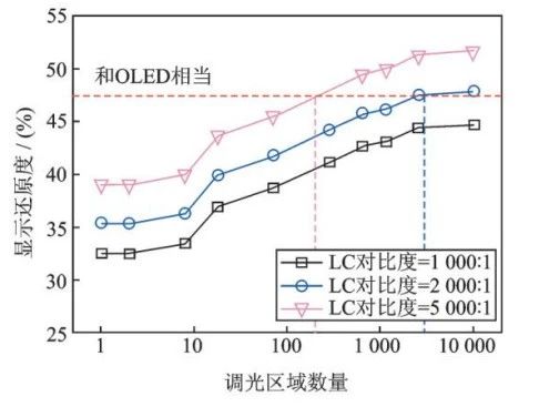 具體而言,OLED技術(shù)的高對(duì)比度源于其像素級(jí)別的調(diào)光技術(shù),也就是具有足夠多的調(diào)光區(qū)域,LCD的對(duì)比度由LC層和背光調(diào)光設(shè)計(jì)共同決定。為了達(dá)到與OLED相同的表現(xiàn),當(dāng)LC層的對(duì)比度達(dá)到5000:1時(shí),需要200個(gè)調(diào)光區(qū)域;當(dāng)LC層達(dá)到對(duì)比度2000:1時(shí),需要3000個(gè)調(diào)光區(qū)域。傳統(tǒng)的LED背光不能分出足夠的可控區(qū)域,如果采用Mini-LED背光技術(shù),就可以達(dá)到需要的控制精度要求。
