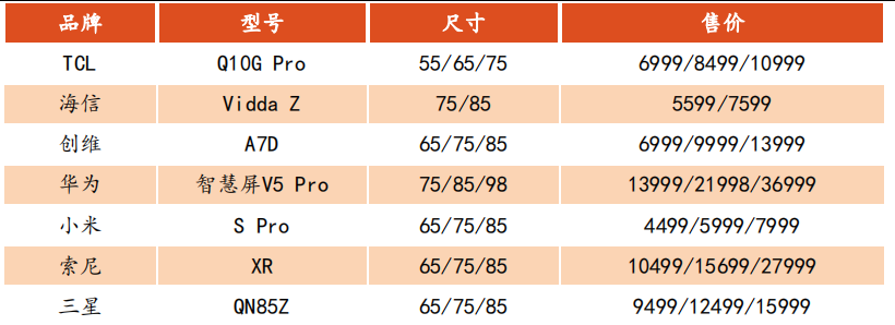 Mini-LED背光TV到達(dá)價(jià)格甜蜜點(diǎn),預(yù)計(jì)滲透將加速。目前,大部分品牌的Mini-LED背光電視價(jià)格普遍降價(jià)至1萬(wàn)元以下,雖然仍為普通LCD電視價(jià)格兩倍以上,但是已經(jīng)進(jìn)入普通消費(fèi)者可接受的價(jià)格范圍。Mini-LED電視相比LCD可以獲得更佳使用體驗(yàn),而OLED電視價(jià)格普遍還在2萬(wàn)元以上,如果消費(fèi)者需要選擇一款高端電視,則Mini-LED會(huì)成為消費(fèi)者的首選。
