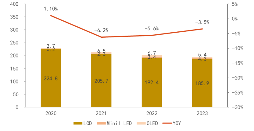 圖:2020-2023 年全球 TV 出貨量(單位:百萬(wàn)臺(tái))