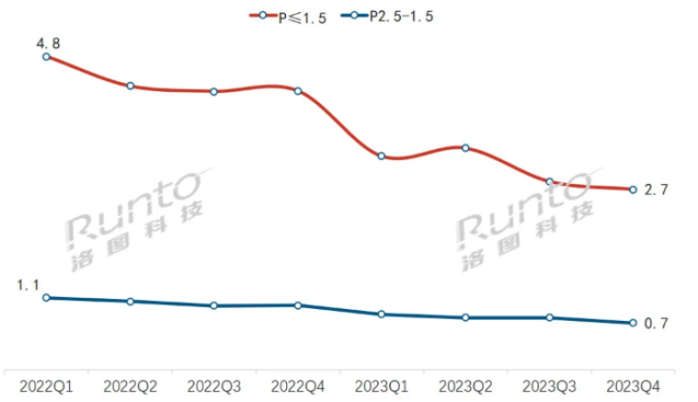 微縮化趨勢(shì)不改,但進(jìn)程有所放緩。LED小間距終端市場(chǎng)分間距來(lái)看,根據(jù)迪顯咨詢數(shù)據(jù),2023年全年P(guān)1.2mm為主的間距段銷額出貨位居首位,P1.0mm以下的微間距產(chǎn)品銷額占比破10%,但是兩項(xiàng)產(chǎn)品同比2022年度僅有微幅成長(zhǎng)。P1.5-2.5仍然占據(jù)60%以上的出貨份額,仍是渠道市場(chǎng)的出貨主力產(chǎn)品。