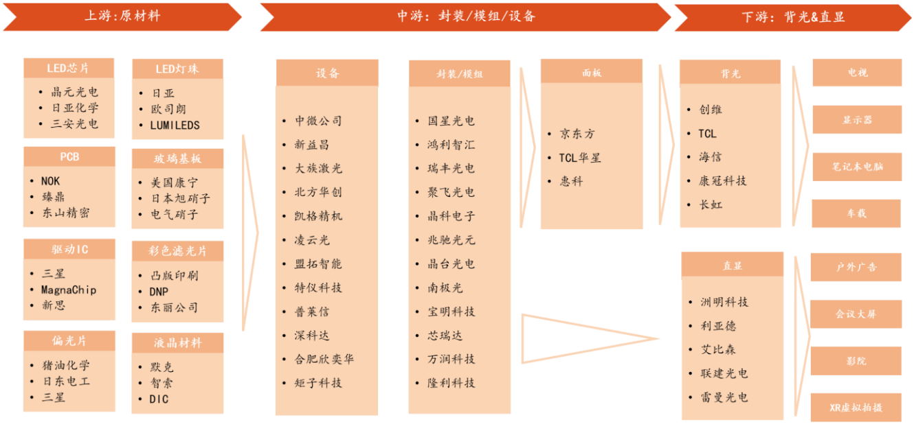 Mini-LED背光和直顯產(chǎn)業(yè)鏈相似,上游原材料包括LED芯片、燈珠、PCB、玻璃基板、驅(qū)動(dòng)IC等;Mini-LED直顯使用RGB三色芯片可以作為像素點(diǎn)直接顯示圖像,Mini-LED背光本質(zhì)是仍是液晶顯示,Mini-LED作為外部光源后通過(guò)濾色片顯示顏色,因此在中游環(huán)節(jié)直顯相比背光省去了背光模組和液晶面板環(huán)節(jié);在下游環(huán)節(jié),背光目前主要應(yīng)用在電視、顯示屏等領(lǐng)域,直顯主要應(yīng)用在戶外廣告、會(huì)議大屏等領(lǐng)域。