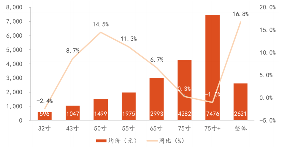 圖:2024 年 2 月中國(guó)彩電線上市場(chǎng)分尺寸均價(jià)及同比