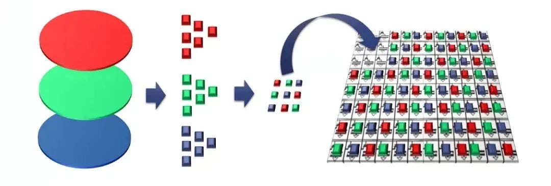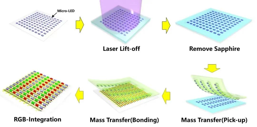 巨量轉移技術是Micro-LED顯示技術中的關鍵步驟,旨在將大量微小的LED芯片從生長基板高效、精確地轉移到目標驅動基板上,以構建高密度、高質量的顯示陣列。由于Micro-LED的尺寸遠小于常規LED,轉移過程具有極高的挑戰性,尤其是在數量、速度、精度、良率、穩定性和成本方面。因此,巨量轉移技術成為了Micro-LED技術實現大規模產業化的關鍵所在。