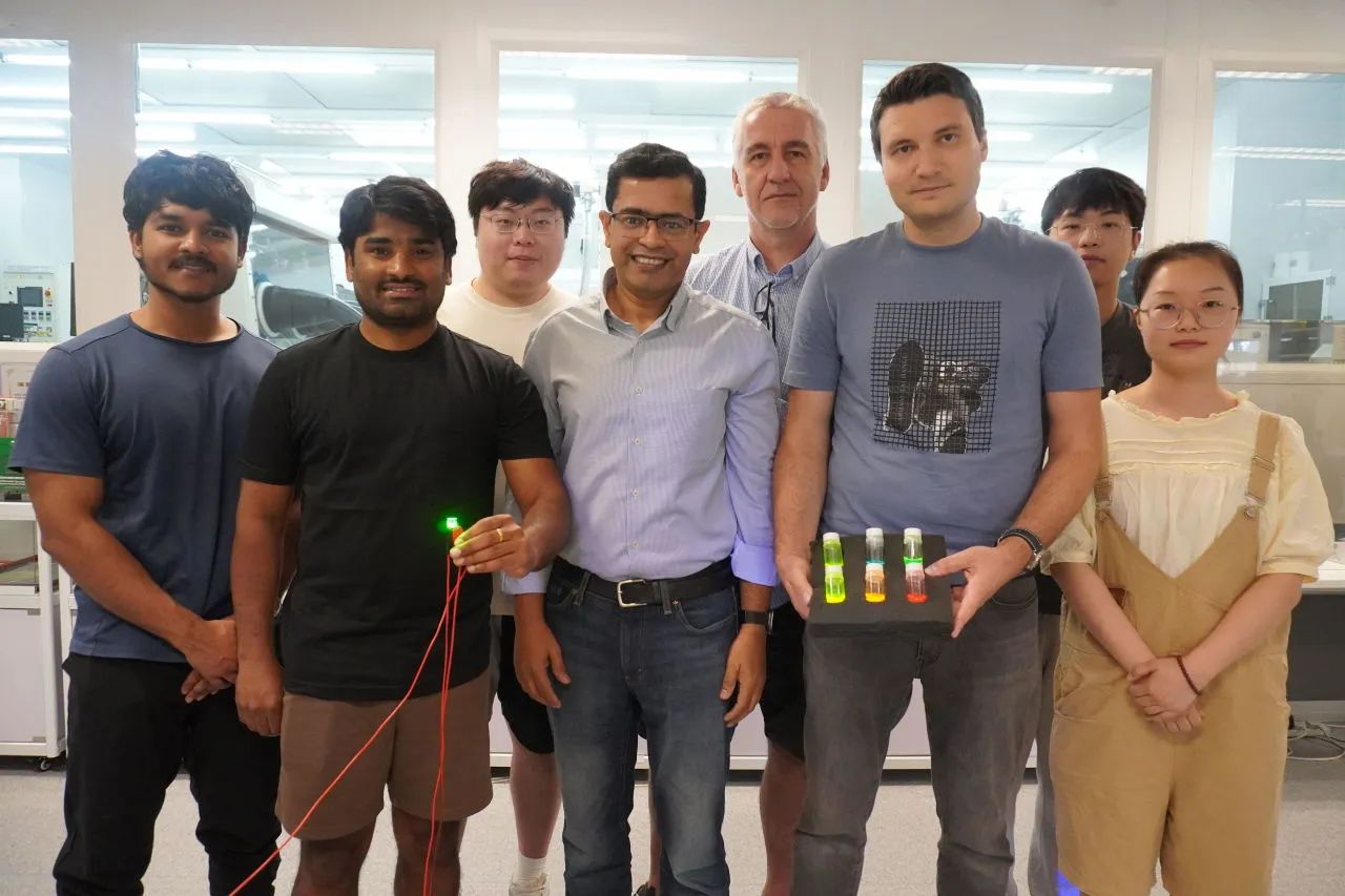 Abhishek K. SRIVASTAVA教授(前排中間)、Maksym PRODANOV博士(前排右二)和Kumar MALLEM(前排左二)與其研究團隊成員合影。Prodan博士手持的三個瓶子內,載有量子棒材料。Mallem則手持綠色發光QRLED樣本。
