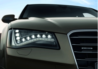 在車頭燈中安裝LED晝間行駛燈,是奧迪最新車型的一大配置亮點。在奧迪的全新旗艦車型A8中,歐司朗LED在車頭燈中的應用更為廣泛——不僅遠光燈和近光燈采用了OSTAR車頭燈產品平臺的節能型LED光源,高速公路遠光燈、轉向燈、全天候燈等特殊照明燈也都采用了LED光源。技術方面有顯著的進步,在車頭燈中可以看得見單個光源,夜間行駛時能明顯區分奧迪與其他品牌的汽車。