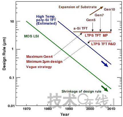 圖1:通過與MOS LSI比較總結TFT設計工藝的發展趨勢在得到ITC'10允許后從發表資料轉載而來。