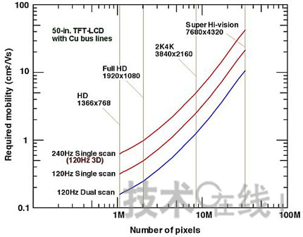 圖3:對新一代FPD要求的TFT遷移率進行的匯總 50英寸和70英寸面板的2K×4K面板以及50英寸超高清面板的示例。在得到ITC'10允許后從發表資料轉載而來。